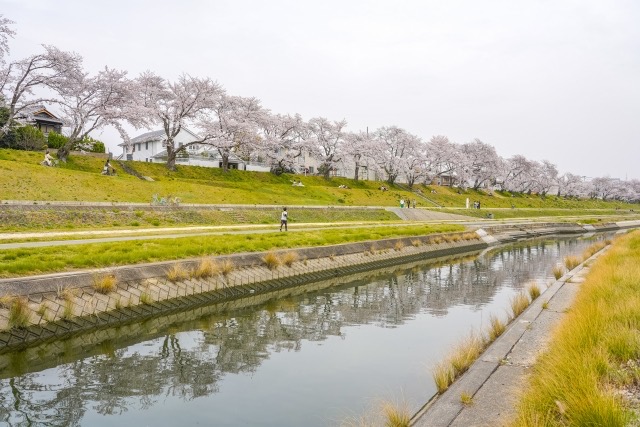 桜の絨毯の上を自転車で通った岡山朝日高校近く、旭川の桜。後楽園の横だっけかな。