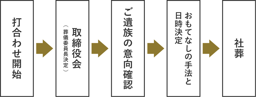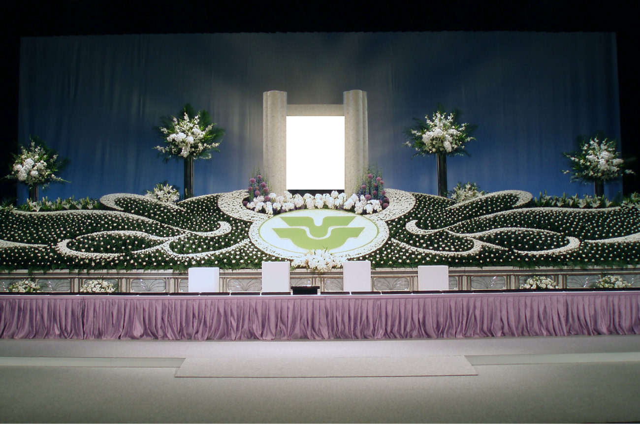 さいき葬祭の「社葬・団体葬」は、場所や規模などの条件を選ばず、各ホールはもちろん、自宅、寺院、会社様の倉庫などであっても、さいき葬祭の手が入った以上は、ご納得いただける設営をさせていただきます。まずはご相談ください。